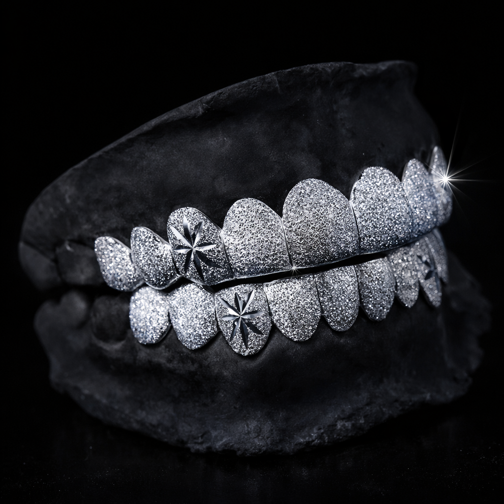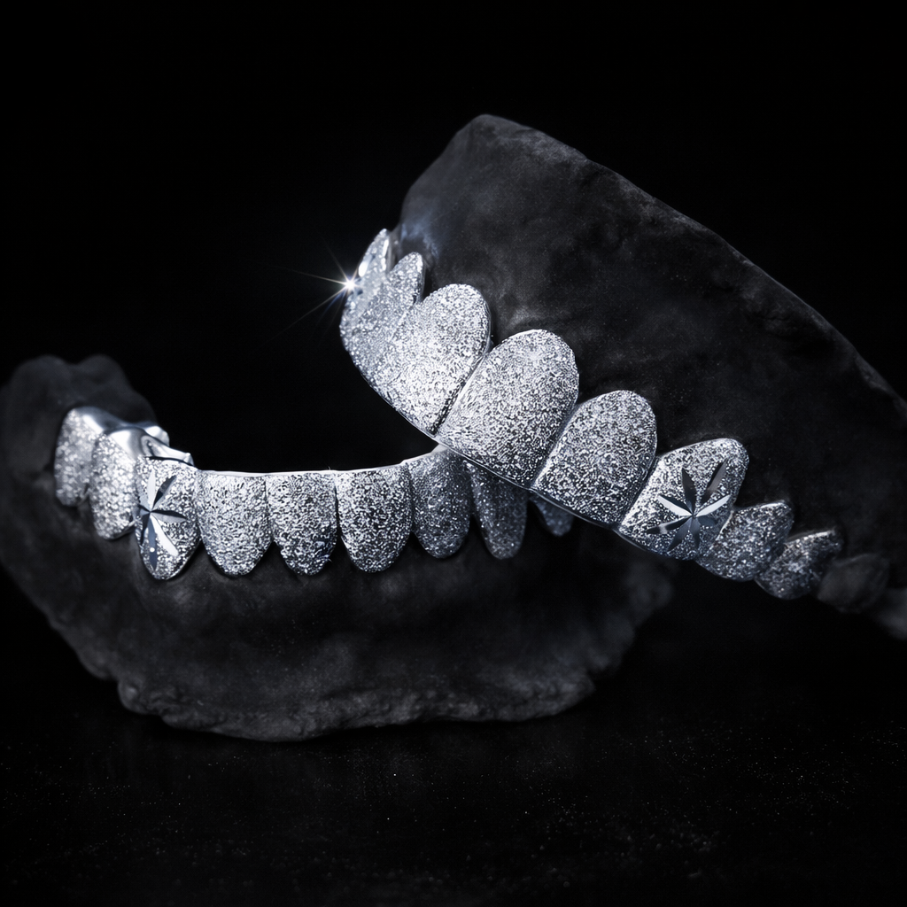 The Cavère Diamond Dusted Grillz embody modern luxury with a clean, frosted aesthetic. Designed for a flawless custom fit, this piece delivers a smooth, fully covered finish that reflects light with a subtle yet powerful shine.