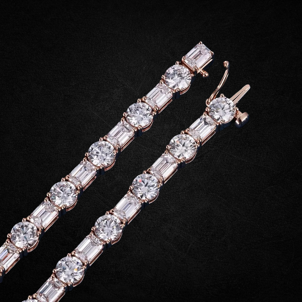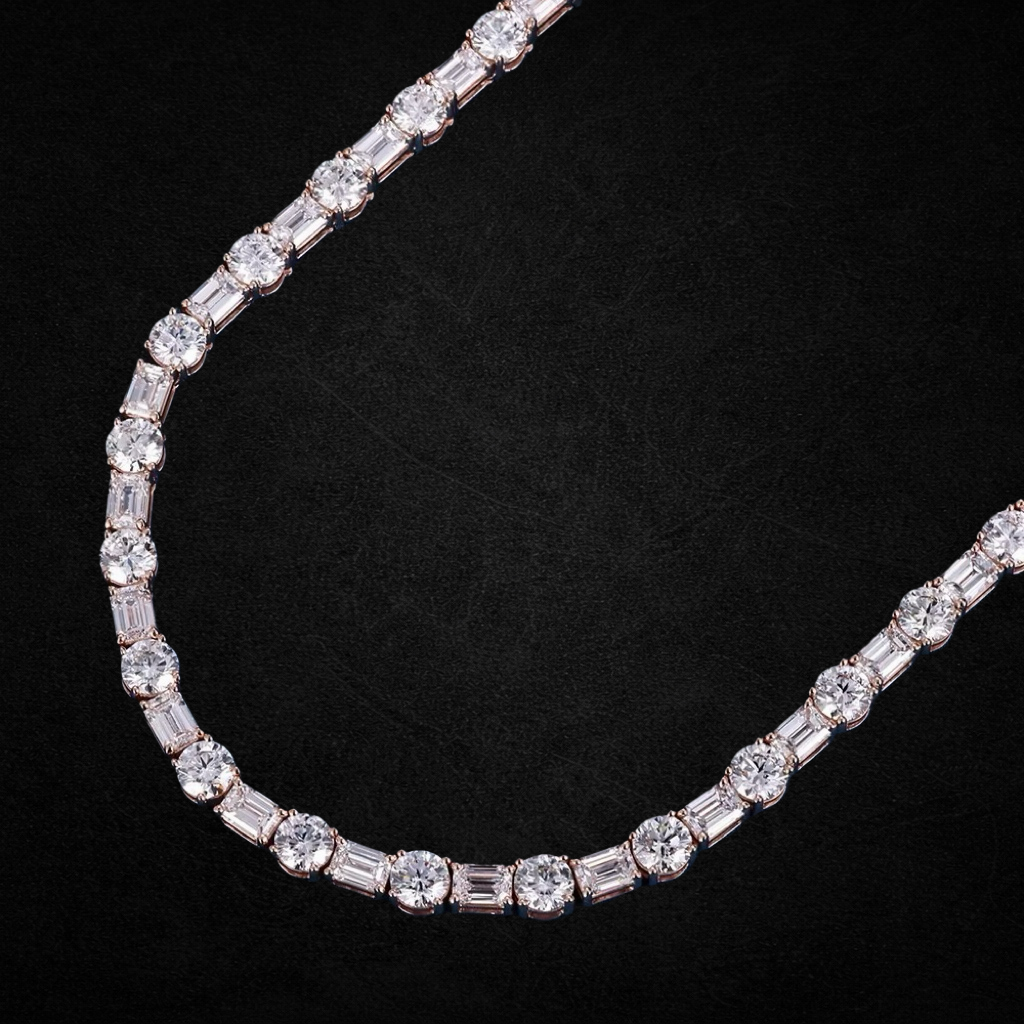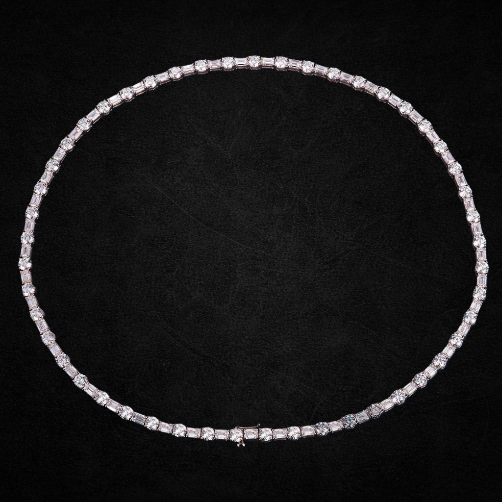 A refined tennis chain featuring alternating round and baguette-cut stones for exceptional brilliance and contrast. Designed with precision-set moissanite stones, this piece delivers a bold yet elegant look that elevates any style while maintaining timeless sophistication.